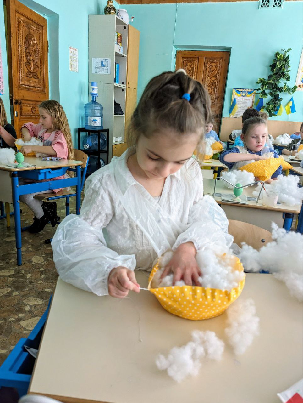 – Перед початком ми застеляємо поверхні скатертиною й захисною плівкою (за потреби), видаємо фартушки, щоб одяг залишився чистим.